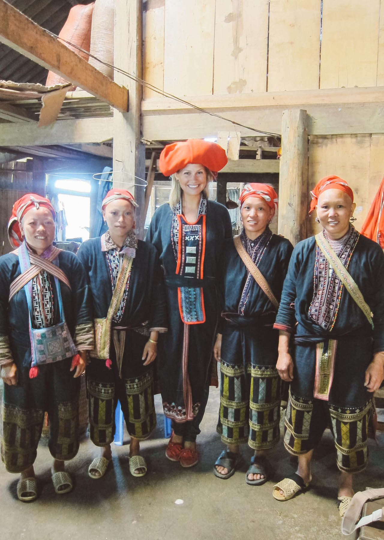 The woman, her husband, and her three children shared their home with five other women. The Zao are known for their extremely intricate embroidered handiwork. They showed me their little craft area and I bought one of their traditional headscarves from them after they fully dressed me in one of their own outfits.