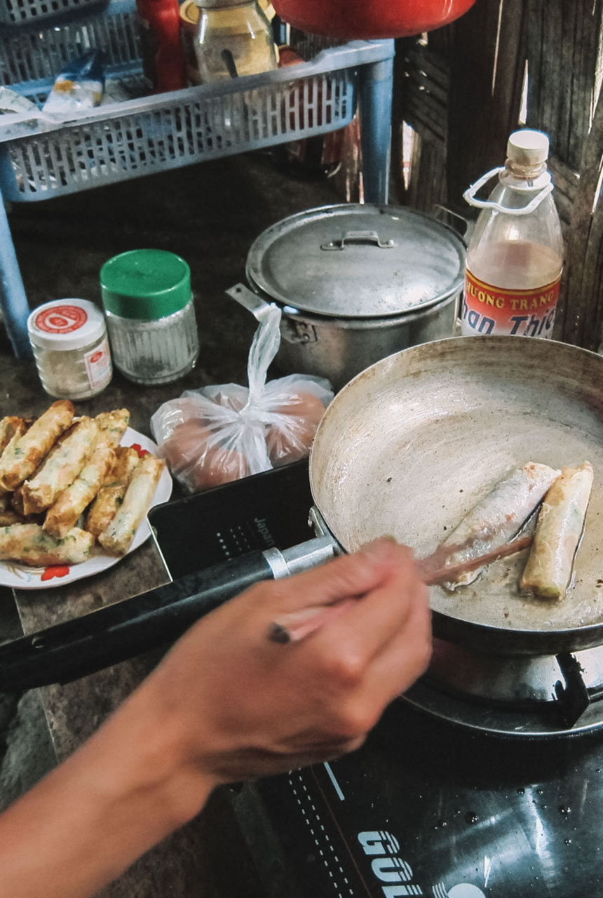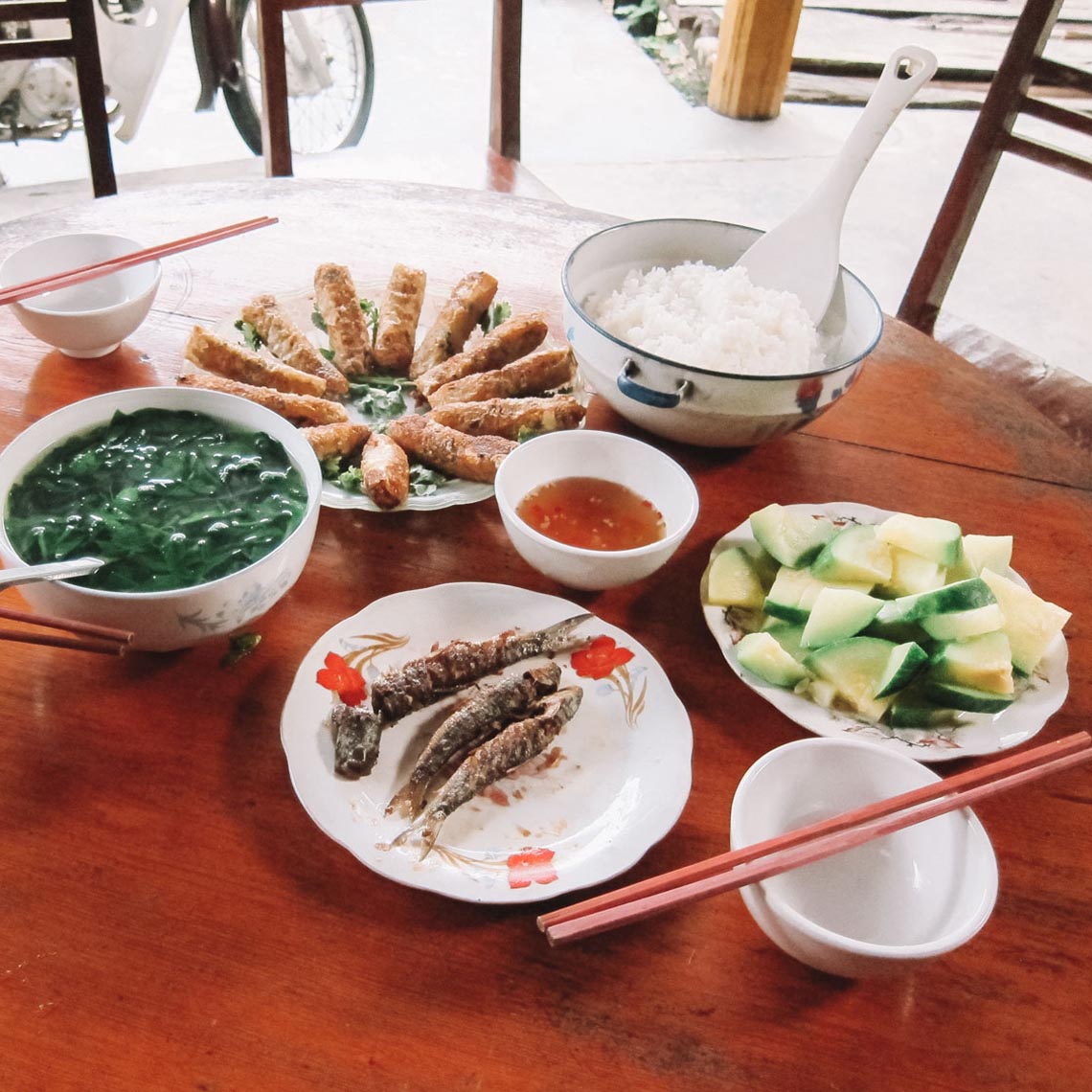 After some exploring around the village, and we arrived back at our family home, we started the long process of preparing dinner. Hong arranged for us to have vegetable spring rolls with homemade sweet chili sauce, steamed rice, veggie soup, steamed pumpkin, and fried river fish.