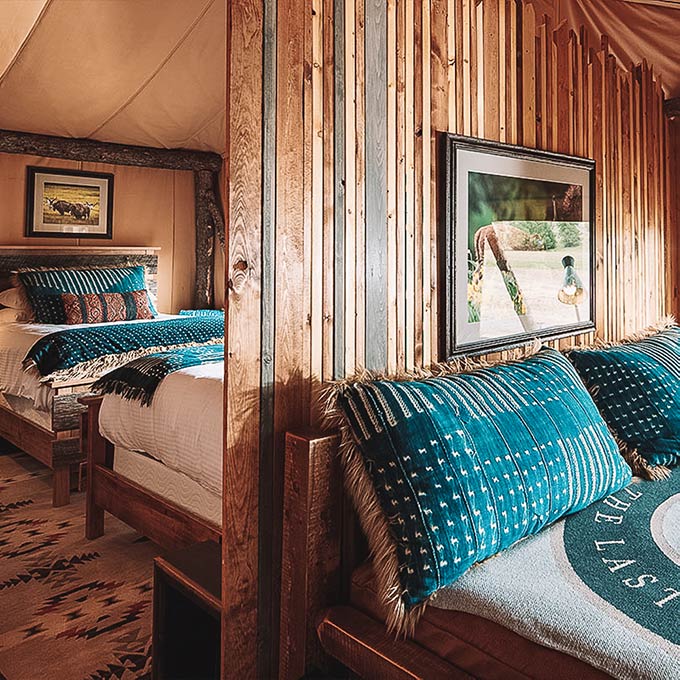 The camping at Paws Up Resort is truly luxurious, as the resort has several tent suites situated on their property. The glamping tents come with a deck, comfy chairs, and a luxurious bed.