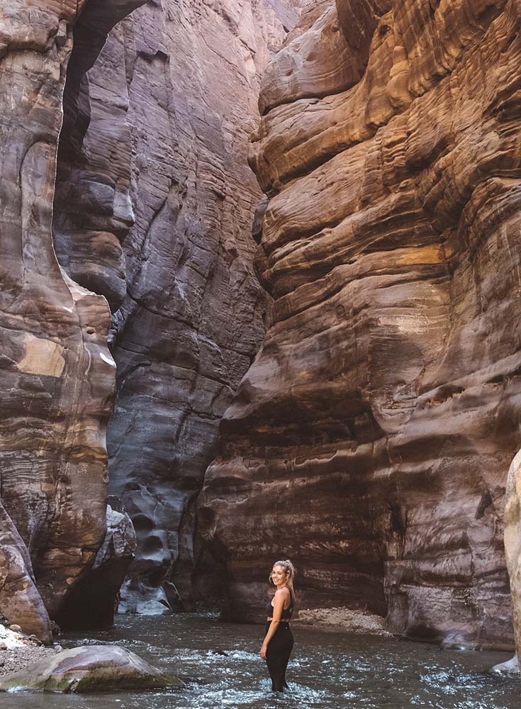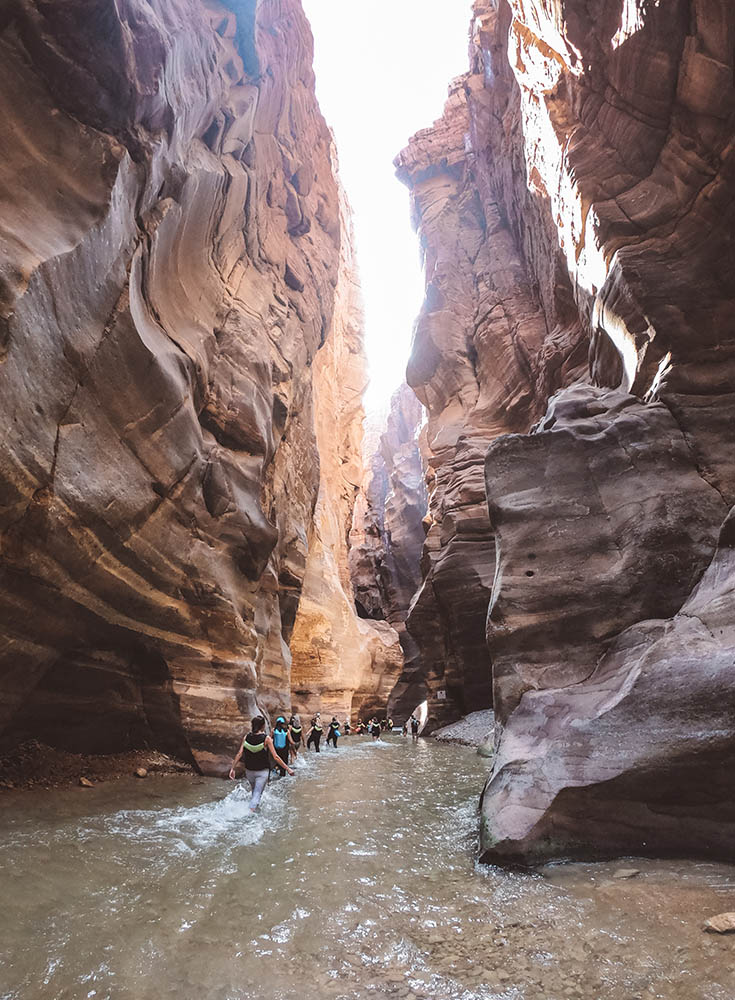 Wadi Mujib is another adventurous highlight of traveling in Jordan! The Wadi Mujib Biosphere Reserve is home to a 70km/44 mile-long sandstone canyon, cut out by the Mujib River. It is one the top must-sees in Jordan and you can “canyon” or hike a portion of it!