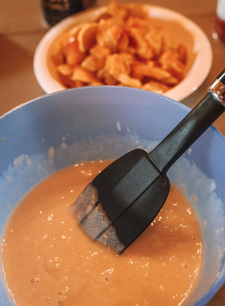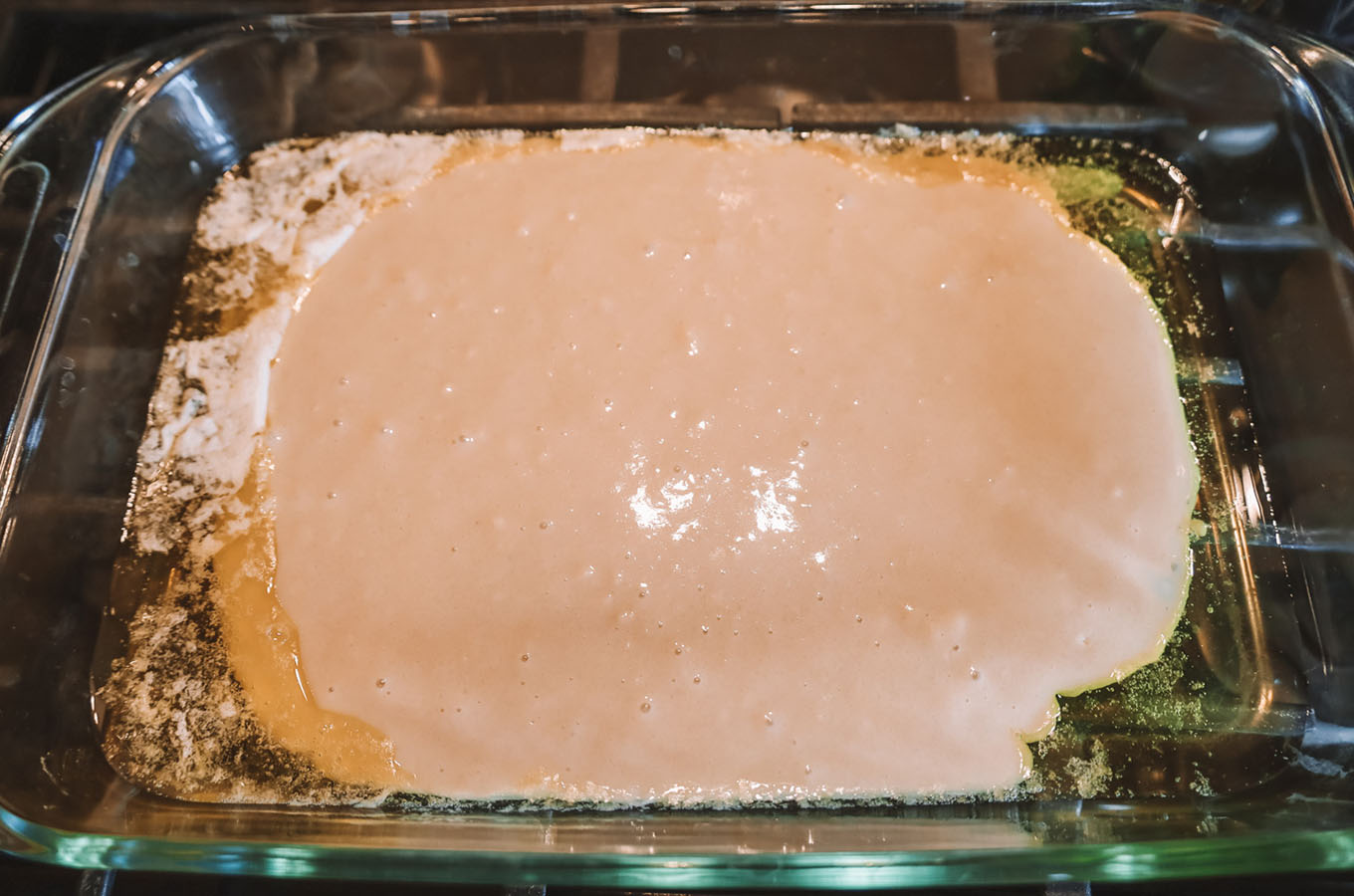 - Once the butter is melted, take the dish out of the oven and pour the mixed batter into the dish.
