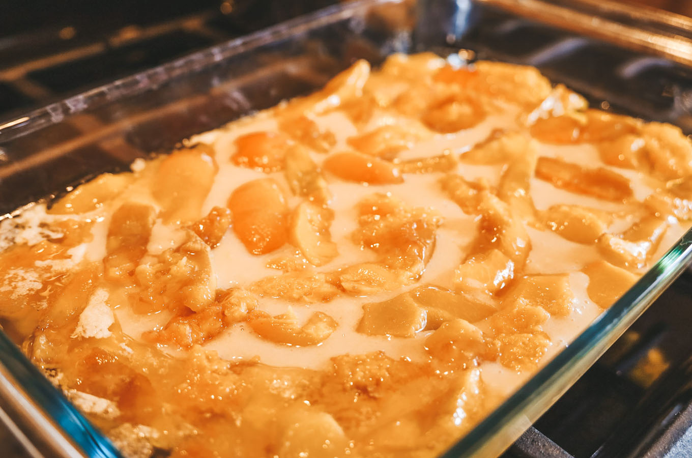 - Place the fresh fruit over the batter. If you’re using canned fruit, pour the fruit and juice over the batter. If you want your batter to be less runny, you can drain some of the canned fruit juice, but it’s a purely personal preference.