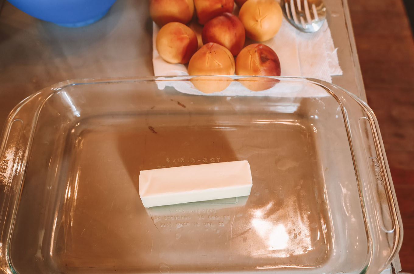 - Place the stick of butter in an 11 x 7 x 2-inch baking dish and place in the oven (while preheating) until the butter is melted.
