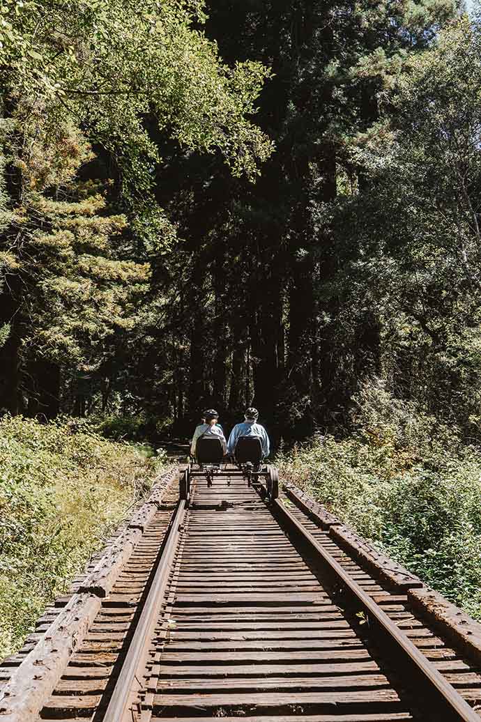One of the most famous attractions in Mendocino County is the historic Skunk Train. They’ve now opened up a new experience that gives you a totally different perspective of the redwoods—a guided tour on motorized railbikes that sit on the rail tracks.