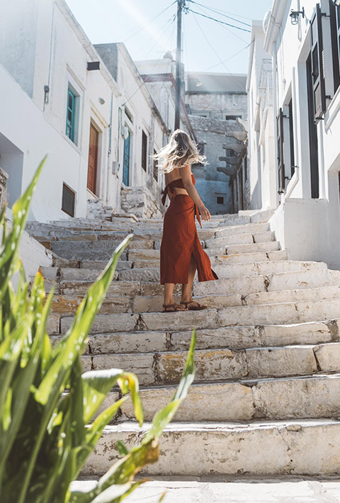You can fly in from Athens or you can take the ferry. If you arrive by ferry, you’ll arrive in the Port of Naxos which is right next to the Temple of Apollo — this is where most people go and it’s one of the best spots for sunset.