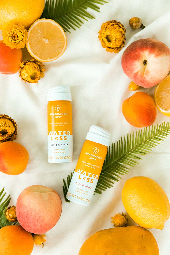 The Waterl<ss Fragrance Mists come in Rose & Peach Fragrance Mist and Apple & Berry Fragrance Mist. They work to keep frizz at bay.